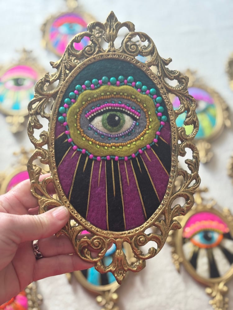 Needle felted wool with embroidery and bead embellishments, presented in a vintage frame. Signed and ready to hang.